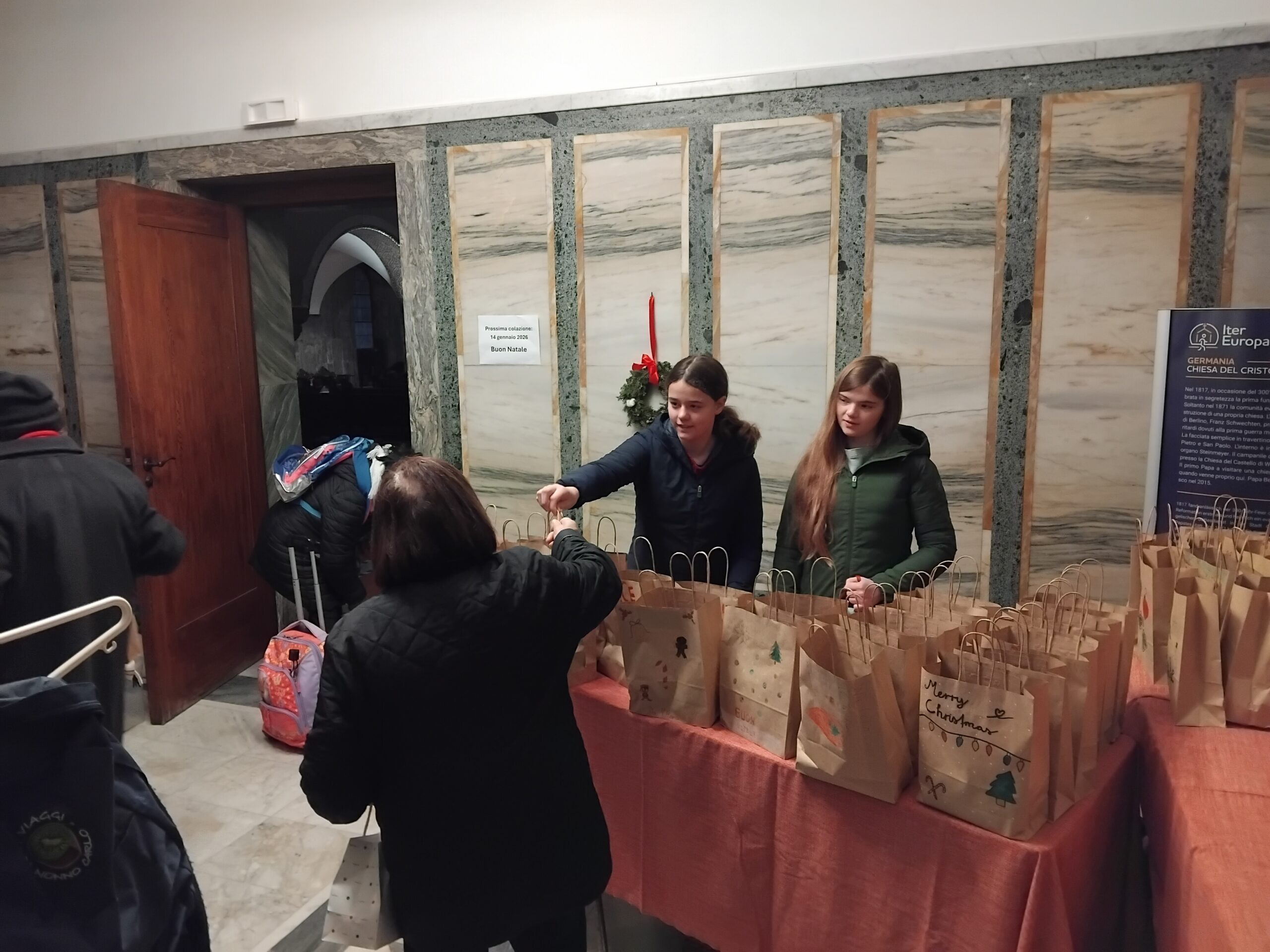 Schüler der Deutschen Schule Rom hatten über 80 Geschenktüten liebevoll gestaltet und für den Inhalt gesammelt. So konnten die Tüten mit Konserven und Brot, Schokolade und Mandarinen an unsere Bedürftigen verteilt werden. Herzlichen Dank an alle, die mitgewirkt haben!